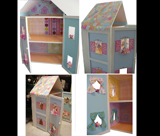 I finally finished Lucy's dolls house. It's been a bit of a rush job because Lucy has been home sick a lot from school. As it is part of her Christmas present I couldn't work on it whilst she was home. The idea came from mum she wanted to buy her a Le Toy van house but they are very expensive. I happened to find a little wooden cupboard at my art supply shop for 18 euro. can't beat that price!!! My husband's uncle is a cabinet maker so he cut the windows for me and put on the pitched roof. As it turns out it is almost the exact same measurements as the Le Toy Van house mum wanted to buy. I painted the house, glued papers on the wall (not very well in too much of a hurry), made flower boxes, shutters and curtains and then decorated the roof. All in all the overall effect is great we have bought some of the Le Toy van furniture and dolls to go inside. I made the felt could the dolly's sitting on! I am also making some little embroidered felt rugs to put inside. Anyway it's finally wrapped and next to the tree, I tucked it away as best I can. Of course Lucy came home yesterday and said 'what's that mummy a house??'. I mean really how cluey are these kids she's only three years old and already figuring out her presents based on shape!! Scarey! Few more images on flickr